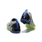 Starting at the top of the shoe, a short bright blue tab is placed over a silvery platinum base at the upper tongue — the blue accents also appear along the ripstop backstay that comes with orange “Vapormax” branding. Most of the uppers come in a muted gray palette, textured by its stretchy Flyknit weave, while subtle hints of neon appear at the eyelets and mid-section. To match the shade of the laces and side Swoosh, a black heel counter is placed just over the glossy Air unit cushions. As a finishing note, fluorescent volt highlights appear at the midsole’s forefoot, creating a bold two-toned contrast at the sneaker’s foundation.