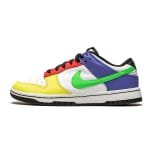 Giving the nod to the silhouette's 80s roots, the Wmns Dunk Low 'Green Strike' emerges with a vibrant color-blocked look. Built with leather, the shoe's upper appears in white, overlaid by sapphire, Vintage Yellow and Ember Glow, with Green Strike marking the Swoosh branding. The tongue tag and heel patch add contrast in black, matched underfoot by the concentric rubber outsole that offers traction.