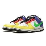 Next up for the popular model is the new “Green Strike” Nike Dunk Low. The latest style switches things up from its traditional two-tone color blocking as the white-based leather upper is coupled with multi-colored overlays including yellow hits at the forefoot, red eye stays, and a purple counter. Adding to the bold style is green Swoosh branding on the sides. Breaking up the colorful look is a black sock liner, white midsole, and a black outsole.