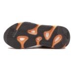 On the “Enflame Amber,” the mesh base and suede overs appear in a yellowish grey hue. The blue detailing on the vamp is similar to that of the look of the model’s original “Wave Runner” design. The chunky Boost cushioned midsole is painted orange and is similar in design to the “Enflame” Yeezy Boost 700.